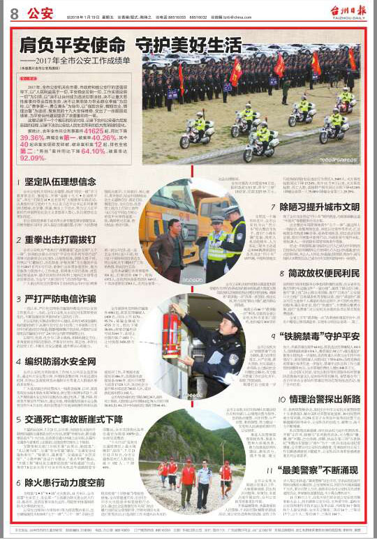 全市公安机关围绕公安重点工作、大案要案侦破、民生热点问题等,有策划、有重点地开展宣传,为强势治安推波助澜,为广大民警呼喊点赞,台州公安铁军形象更加牢固。
