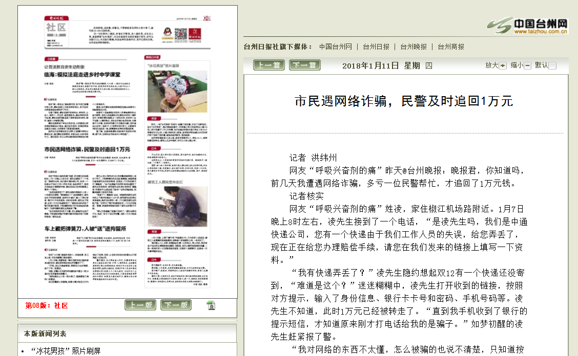 网友“呼吸兴奋剂的痛”昨天@台州晚报:晚报君,你知道吗,前几天我遭遇网络诈骗,多亏一位民警帮忙,才追回了1万元钱。