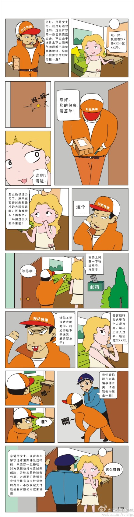 话说张警官隔壁王阿姨某天接到快递公司上门送快递,快递人员送了一个大包裹给王阿姨。签收后不久,王阿姨就接到陌生男子电话:“你收了我们的东西,要汇款XX元,不给我们就上们索讨,嘿嘿……。”民警小张提醒大家,来历不明快递勿随便接收,接到类似电话应立即报警。