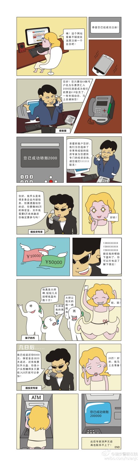 话说民警小张的邻居何阿姨是个“理财迷”,喜欢上网找理财产品。她在网站注册的账号接到“砖家”电话称帮谁赚了N多钱,还让致电查询。果然,这些人大赞砖家牛X。何阿姨先后往砖家账户转了N多万,随后砖家失踪。小张提醒,金子见到的才是真,拒绝“电话转账”方是王道。